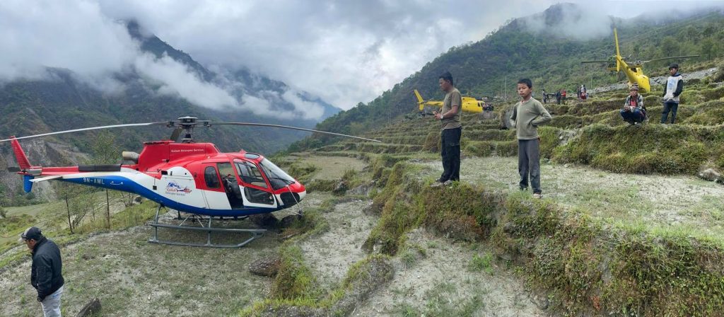 धौलागिरि आरोहणमा गएको पूर्णिमा श्रेष्ठलगायतको टोलीलाई लिन बिहीबार धौलागिरि आधार शिविरतर्फ जाँदै गरेको हेलिकोप्टर मौसम खराब भएपछि धौलागिरि गाउँपालिका क्षेत्रमा अवतरण गरिएको छ । तस्वीर ः रासस
