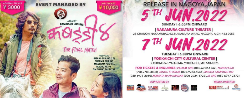 नागोया । नेपाली चलचित्र कबड्डी ४ : द फाइनल म्याच २०७९ जेठ १३ गतेदेखि नेपालभर प्रदर्शनको तयारीमा छ । दर्शकहरुको तीव्र पर्खाइमा रहेको यो चलचित्र नेपालबाहेक अन्य मुलुकहरुमा पनि प्रदर्शनको तयारीमा रहेको छ । नेपालीहरुको बाक्लो उपस्थिति रहेको जापानका विभिन्न शहरहरुमा ‘कबड्डी ४ : द फाइनल म्याच’ आगामी जुन ५ (जेठ २२) बाट प्रदर्शन हुन लागेको हो ।