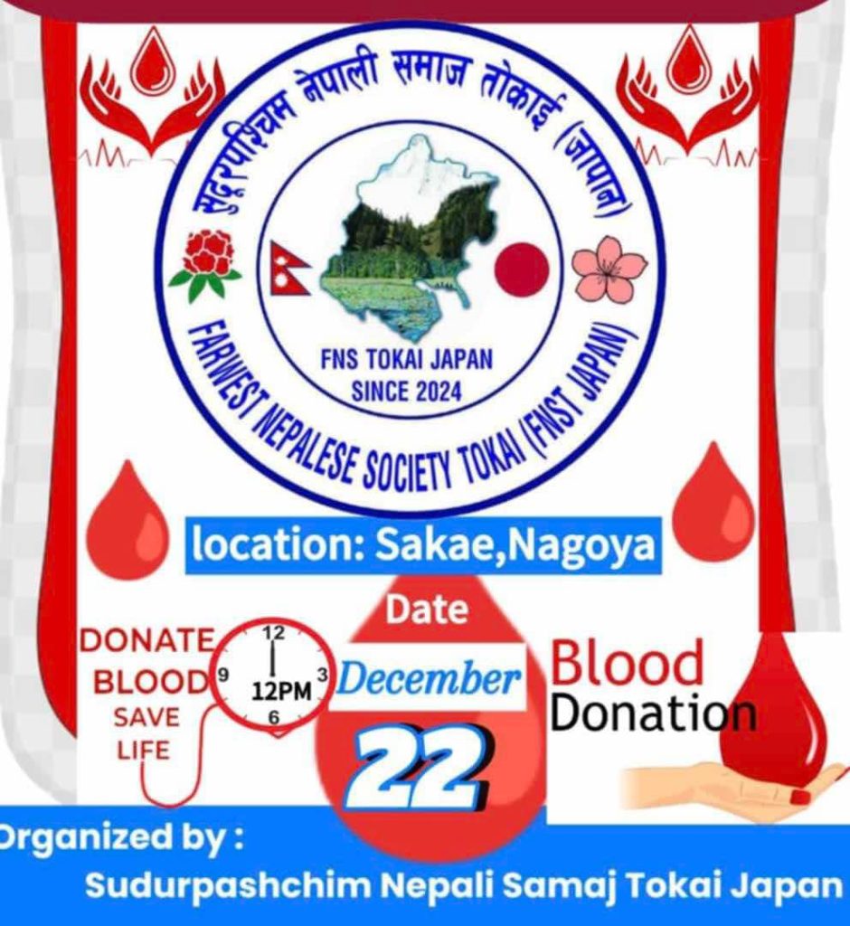 नागोया। सुदूरपश्चिम नेपाली समाज (तोकाई) नागोया जापानले रक्तदान कार्यक्रम आयोजना गरेको छ। आगामी डिसेम्बर २२ तारिख आईतबारका दिन नागोयाको सकाएमा रक्तदान कार्यक्रम आयोजना गर्न लागिएको समाजका उपाध्यक्ष कुल रावलले बताए।