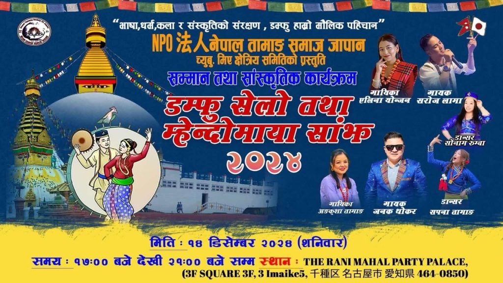 आगामी डिसेम्बर १४ तारिख शनिबार नागोयाको इमाईकेस्थित द रानी महल पार्टी प्यालेसमा  “भाषा,धर्म ,कला र संस्कृतिको संरक्षण , डम्फु हाम्रो पहिचान” भन्ने मूल नाराको साथ भब्य सांस्कृतिक कार्यक्रम गर्ने लागेको अध्यक्ष हरिदोङ्ग तामाङले बताए।